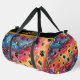 This colorful pattern duffle bag features a mesmerizing swirling cosmic design in vibrant hues, liberally accented with classic black paw prints and twinkling stars. It's a unique and stylish pet accessory, perfect as a travel storage carrier for any pet lover.