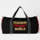 This black and red duffle bag celebrates the profound impact of educators, featuring the inspiring phrase "TEACHERS Change THE WORLD" in a bold, two-toned font with decorative accents. It's an ideal gift for dedicated teachers, mentors, and anyone passionate about making a difference through education. Edit color of the bag caps and body in the Design tool to your favored colors.