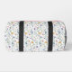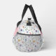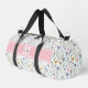 Add a soft, colorful touch to your everyday essentials with this elegant duffle bag featuring a delicate wildflower pattern in pastel shades of pink, purple, blue, yellow, and green on a clean white background. The design is printed on both of the large main sides of the bag, each featuring a pink bar with a white and gray monogram for a graceful, personalized look. The wildflower pattern continues onto each end of the duffle for a cohesive, polished design.