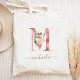 Ce sac élégant comporte un grand monogramme en forme de lettre "M" en faux or rose, orné d'un bouquet floral vintage ivoire agrémenté de feuillage vert et or rose. Personnalisez-le avec son nom écrit à la main en rose gold, avec des fioritures au début et à la fin. C'est le cadeau idéal pour une demoiselle d'honneur ! D'autres lettres de l'alphabet sont disponibles dans notre boutique Zazzle. (Pour conserver les fioritures, remplacez uniquement les lettres du nom.)