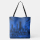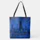 Sac fourre-tout moderne bleu et noir avec la ligne d'horizon de Chicago. Texte personnalisé à l'avant du sac. Conservez le texte "Chicago" ou changez le nom, le texte ou la phrase que vous désirez. Couleurs bleu et noir. Chicago, Illinois skyline est sur le devant de la fourre-tout. Utilisez le modèle pour créer votre propre sac fourre-tout d'horizon de Chicago.