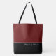 Ce charmant sac fourre-tout à la mode affiche le mot "Demoiselle d'honneur" en texte blanc sur fond noir avec le haut du sac en rouge Crab Apple personnalisé. Il y a beaucoup de place pour du texte personnalisé. Les graphiques et le texte sont sur les deux côtés de ce sac fourre-tout. Poignée noire. Personnalisez davantage ou achetez tel quel.