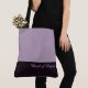 Ce charmant sac fourre-tout à la mode affiche le mot "Maid of Honor" (demoiselle d'honneur) en texte blanc sur un fond de couleur pourpre-améthyste sombre et fumé avec le haut du sac en couleur Prune Sucrée personnalisée. Il y a amplement de place pour du texte personnalisé. Les graphiques et le texte sont sur les deux côtés de ce sac fourre-tout. Anse noire. Personnalisez davantage ou achetez tel quel.