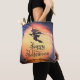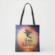 Une sorcière qui vole à travers le ciel avec un joyeux message d'Halloween. Ce design semble vraiment efficace sur ce Sac fourre-tout