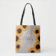 Sac fourre-tout burlap élégant avec design de tournesol jaune radiant et votre nom dans la calligraphie de script hors-noir élégant. Conçu exclusivement pour vous par Happy Dolphin Studio. Si vous avez besoin d'aide ou de produits correspondants, veuillez nous contacter à happydolphinstudio@outlook.com