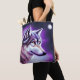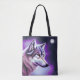 C'est un beau sac fourre-tout pour un amoureux du loup avec l'illustration d'un profil de visage de loup mystique dans les tons blanc et violet et bleu.