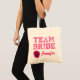 Sac fourre-tout en toile de mariage amusant avec un graphisme rose en détresse lecture de texte Team Bride. Le texte de script rose personnalisé, en bas, est prêt à personnaliser pour toute la fête de mariée. Les graphiques numériques d'une fleur rose ornent le bas à gauche. Parfait pour tenir toutes les petites choses importantes que les membres du parti nuptial ne peuvent pas oublier.
