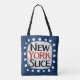 Un design de message typographique amusant et mignon qui dit "New York Slice". Il a du texte noir et rouge sur un rectangle blanc avec des points blancs amusants autour, le tout sur un arrière - plan bleu.