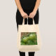 Ce beau sac fourre-tout est illustré d'une photographie d'une bande de tomates cerises vertes non mûres poussant sur un plante de tomates dans un jardin de banlieue. La photo a été prise en utilisant la macro photographie pour un résultat détaillé. Le design est présenté sur un sac fourre-tout bio d'épicerie, mais est également disponible sur d'autres styles et couleurs de sacs.