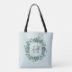 Elégant modèle de couronne d'eucalyptus aquarellisé sur un arrière - plan bleu pâle. Personnalisez avec votre nom et votre initiale.