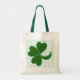 Feuilles de trèfle en vert. De petits contours de feuilles sont disposés en mosaïque pour créer une impression de fond. Un grand trèfle de couleur vert foncé et contourné de vert clair est centré. Même motif sur les deux côtés.