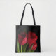 Ce sac fourre-tout est orné d'un bouquet de tulipes rouge écarlate et de feuilles verts posés sur un arrière - plan noir pur. Une idée merveilleuse pour les jardiniers !