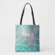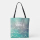 Citation de plage sac fourre-tout sur le design d'art de plage tropical avec océan bleu dans un style aquarelle avec texte des vibes de plage. Art copyright Ann Powell tous droits réservés.