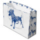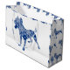 Chien heureux ! Une silhouette à grande échelle de chien à Paisley bleu et blanc, sur un arrière - plan blanc.