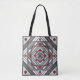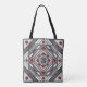 Un mandala carré concentrique prend l'apparence d'un tunnel qui attire le spectateur avec une combinaison de lignes angulaires, de triangles et de cercles dans les tons gris, rouge et blanc pour presque créer une illusion d'optique. Ce sac est disponible en plusieurs tailles et à la fois les styles de sac sac fourre-tout et de sac de carrosserie.