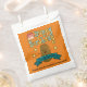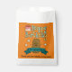 Sacs de fête d'anniversaire adorables pour égayer votre fête. Sur un arrière - plan orange, le design commence par le haut avec Joyeux Anniversaire en texte vert et jaune avec un gâteau avec givrage rose et trois bougies éclairées à côté du H en heureux. En dessous du texte est une jolie patate marron avec bras en bâton et un grand sourire. De l'autre côté de la pomme de terre se trouve une bannière bleue avec un modèle pour ajouter votre nom à personnaliser. Enfin, trois étoiles jaunes sont disséminées autour de la pomme de terre.