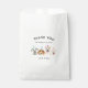 Un sac de faveur mignon pour la fête d'anniversaire du chiot de votre enfant. Illustration de 4 chiens (dalmate, beagle, pit bull terrier) avec casquettes de fête. Le texte ci-dessus dit "merci d'être venu à ma fête." Ajoutez le nom de votre enfant sous l'illustration.