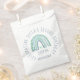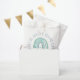 Célébrez l'anniversaire de votre petit avec cette jolie illustration de l'arc-en-ciel boho avec un coeur mignon dans les tons vert menthe et bleu avec un nom personnalisable.