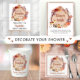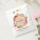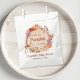 Baby shower rustique à thème d'automne : sacs de faveur avec une aquarelle illustrant une couronne composée d'un tronc d'arbre orné de mignons animaux de bois (hibou, cerf, écureuil et renard), fleurs d'automne et citrouilles oranges. Un "Sweet Little Citrouille Is On His Way" est écrit dans un mélange de typographie simple et d'un script en terre cuite. Précisez le sexe du bébé si vous le souhaitez (p. ex. "est en route").