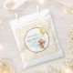 Sac de baby shower à pois jaune en peluche à pois. L'ours en peluche tient un ballon jaune. Personnalisez avec votre nom et la date de l'événement. © Kimbellished, LLC
