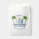 Bébé à bord surf splash bleu bébé garçon douche à l'aide sac de faveur. Préparez-vous à célébrer l'arrivée passionnante d'un bébé avec ce charmant thème de baby shower inspiré par l'océan. Trois planches de surf dans les tons bleus apaisants sont à l'honneur, avec de hauts palmiers et des rayons du soleil. La douce toile de fond bleu clair imite une douce brise océanique, accentuée par une pop d'eau douce d'un bleu aqua rafraîchissant, offrant une atmosphère paisible idéale pour accueillir le futur petit surfeur.