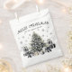 At the bottom of the design is the detailed artwork—a black and white Christmas tree with a soft green tint, surrounded by wrapped presents and delicate falling snowflakes. The clean watercolor style and minimalist layout make this favor bag a stylish and timeless way to package holiday treats, small gifts, or party favors.