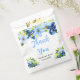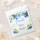 This beautiful and elegant wedding favor bag features watercolor baby blue and navy blue flowers with foliage. The text combines handwritten script and serif fonts for a stylish and modern look. This is perfect for a spring or summer rustic wedding.
