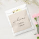 Sac de mariage "bienvenue" chic et élégant, avec des noms de couple dans un ensemble contemporain de polices noires neutres contre un arrière - plan de pêche chic et blush. Cet article fait partie d'une suite de mariages contenant des invitations et stationnaire dans une variété d'articles neutres mélangés et assortis.
