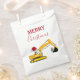 Une jolie illustration d'une pelle de jouets jaune portant un chapeau de Père Noël et décorée de lumières de Noël en train de déterrer des cadeaux de Noël avec les mots "Joyeux Noël". Parfait pour les amateurs de camions de construction de tous âges. Un sac de Noël idéal pour les passionnés de pelleteuses, petits ou grands, filles ou garçons.