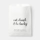 Simple et élégant "mangez, buvez et soyez chanceux" sac de faveur de jour de mariage dans un style design minimaliste moderne avec une typographie manuscrite en noir et blanc classique écrit dans un style décontracté informel. Le texte peut facilement être personnalisé pour un design unique et unique pour votre journée spéciale. La meilleure façon de donner un billet de loterie, une carte à gratter ou des jetons de casino (non inclus) à vos clients mariages.