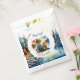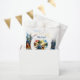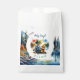 Amusant sac de baby shower à thème de pêche pour garçon. Un jeu de pêche amusant, c'est un garçon. Petit garçon mignon avec un poteau de pêche assis à côté de son chien chiot au bord du lac, des montagnes et des arbres. Elles ont un thème bleu et vert.