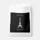 Ce design chic et féminin présente une image blanche de la Tour Eiffel sur un arrière - plan noir. Votre message apparaît dans une élégante écriture française rose. Une façon simple d'ajouter le style de Paris à votre fête avec ces sacs de faveur design.