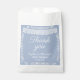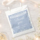 Soft dusty blue baby shower favor bags featuring an elegant white papel picado banner and delicate ornamental border. Personalized with names and event date, this treat bag is perfect for a Cielito Lindo–inspired celebration or classic blue baby shower theme.
