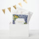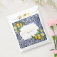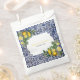 Carrelage traditionnel peint à la main du Portugal avec des citrons méditerranéens. Pièce d'artisanat azulejo bleu et blanc en feuilles florales. Une belle décoration méditerranéenne représentant des citrons jaunes avec leur verdure et fleurit contre un motif portugais vintage bleu et blanc. Le texte mariage est élégamment encadré d'une forme géométrique blanche. Unique Azulejo bleu et blanc floral mariage design de sac de faveur avec des éléments modernes. Des invitations de mariage et d'autres articles de papeterie sont également disponibles.