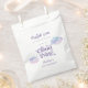 Dreamy 9-e anniversaire sac de faveur avec l'aquarelle illustration de nuages roses, violets et bleus avec un texte typographique qui dit "nous sommes sur le nuage neuf."
