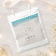 Il comprend deux coeurs dans le sable et les initiales de la mariée et du marié avec l'eau turquoise et l'arrière - plan de la plage de sable blanc, de grands sacs de faveur pour mariage de plage d'été, ou mariage de destination tropicale.