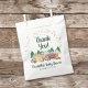 Sacs de faveur pour votre baby shower avec une aquarelle illustrant les animaux des bois campant dans les montagnes et la forêt, une superposition d'étoiles dorées, et "Merci !" et le nom de la future mère dans un script vert de forêt.