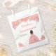 This Quinceanera favor bag features faux glitter pink floral flowers and a beautiful princess with dark skin and an elegant dress. This is perfect for a Quinceanera birthday party.