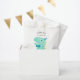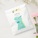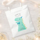 Drôle et mignon fête d'anniversaire sac de faveur pour la fête de dinosaure de votre enfant. Illustration de style dessin animé d'un dinosaure vert aux pointes jaunes. Le t rex porte une cravate arc-en-ciel bleue et un petit casquette de fête. Au-dessus du t-rex, il est dit "Merci pour passer par". Sur son corps il y a un texte qui dit "Amour, Matthieu." Vous pouvez remplacer cela par le nom de votre enfant. Le texte est facilement modifiable en ligne.