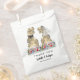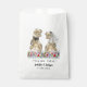 Dégustez vos invités avec ces drôles de dinosaures fleurs sauvages colorés thème mariage Merci sacs de faveur avec les mariés et mariés de dinosaures et le feuillage de jungle jurassique. Facile à customiser avec les noms de mariée et mariée, la date mariage dans le script de typographie moderne. Drôle T-Rex marié et marié et belle aquarelle fleur sauvage illustrations dans les tons violet bleu rose jaune et orange. Dino original unique et oeuvres d'art florales d'été de l'artiste Catherine Sweetman