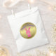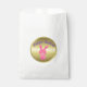 Un adorable sac de faveur de Pâques (parfait pour les petits pour ramasser leurs mini-oeufs à la chasse aux oeufs de Pâques !) qui présente un petit lapin rose doux de Pâques avec une écharpe autour du cou. Au-dessus d'elle se trouve le salut en violet, 'Pâques heureuse' (qui peut être customisé pour convenir) et derrière elle se trouve un cercle doré brillant.