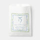 Élégants sacs de favours de fête pour votre douche de mariée avec des cadres aquarelles floraux bleus et verts vintage inspirés du grandmillénaire, un nœud coquette bleu aquarelle délicat, "un doux merci" mis en valeur dans une écriture calligraphique bleue élégante, et le nom de la mariée et la date de la douche dans une typographie serif classique.