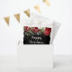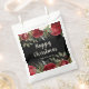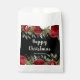 Pretty Christmas party favor bag with red flowers and green foliage. The words can be changed to suit your own details or requirements. Would be perfect for a Christmas dinner party or holiday party.
