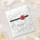 Ce design présente un élégant motif en feuille vintage et une image personnalisée de sceau de cire. L'arrière - plan damassé à motifs de feuilles grises contraste avec le ruban noir et le sceau de cire rouge. Le mélange de gris, de rouge, de noir et de blanc crée un style chic, chic et chic. Elégant design de sac de faveur de mariage avec des éléments modernes. La configuration simple de la typographie lui donne un style distinct. Des invitations de mariage et d'autres articles de papeterie sont également disponibles.