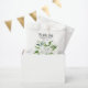 Un sac cadeau mariage avec d'élégantes roses blanches et des fleurs d'haleine pour bébé.