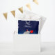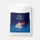 Beau éléphant avec casquette rouge et sac avec cadeaux de Noël sur arrière - plan bleu avec flocons de neige blancs