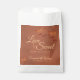 Ces beaux sacs de gâterie sont parfaits pour une table de régal à votre réception de mariage. Elles présentent un design d'automne rustique avec un arrière - plan en terre cuite marbrée et des taches de feuilles d'aquarelle peints à la main dans les tons de rouille orange et de bois brûlé. L'élégant texte du script dit "L'amour est doux s'il vous plaît prenez un plaisir" avec la place pour les noms du couple et mariage date.