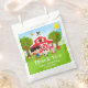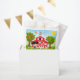 Ce sac à friandises mignon et amusant présente une fille aux cheveux noirs avec une peau claire à côté d'une grange rouge avec une girouette en forme de coq. Il y a des animaux de ferme adorables tels qu'une vache, un cochon et une poule. En arrière-plan, on voit un ciel bleu vif, des pommiers, la lumière du soleil, des papillons et des marguerites. Le texte combine des polices grasses et sans empattement pour un look élégant et moderne. C'est parfait pour une fête d'anniversaire sur le thème de la ferme.