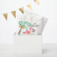 Des sacs de fête d'anniversaire amusants et festifs présentent un flamant rose sur la plage et un cocktail tropical à côté d'un palmier avec une légende "fêtons" dans un script d'écriture moderne et décontractée. Le nom, l'âge et la date peuvent être personnalisés. Parfait pour les fêtes d'anniversaire de piscine, les barques de bord de mer et la plage, les fêtes d'été. Art par KL Stock.