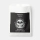 Un crâne et une bordure ornementée sur un arrière - plan noir, et vos détails en lettrage blanc chic, cette fête d'Halloween fêter les sacs de faveur ou de ruse ou de gâter sacs sont amusants pour votre soirée costumée d'Halloween ou donner à tour ou traiteurs. CORRESPONDRE des articles dans notre magasin.